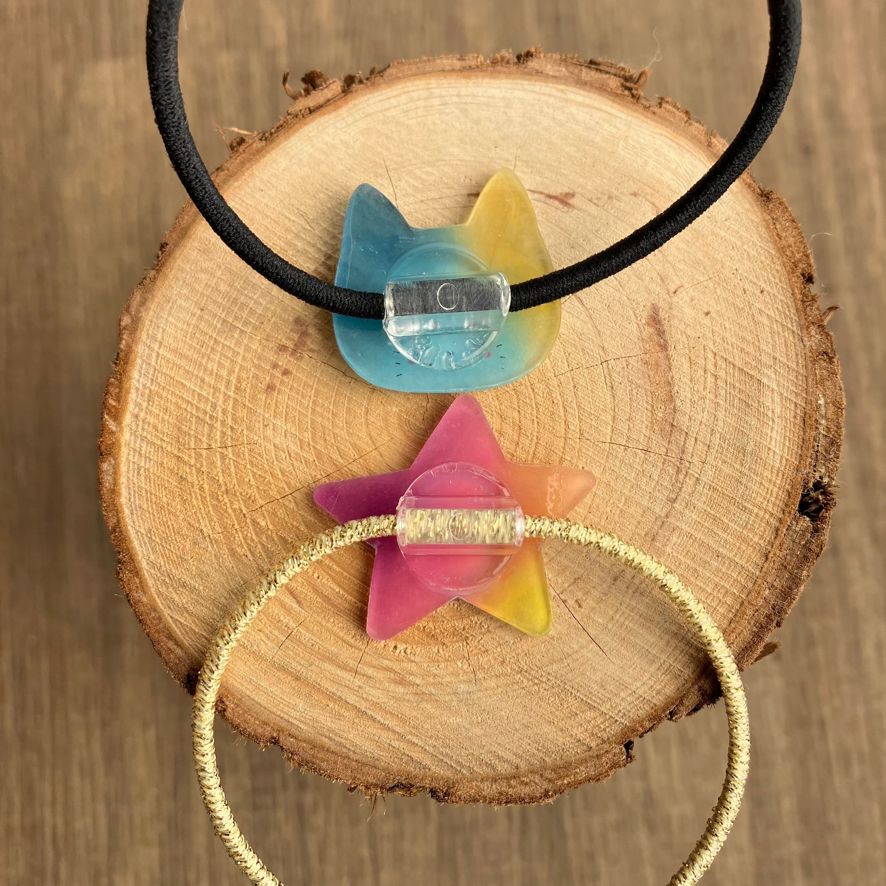 ヘアゴムのカラーは、猫さんがブラック、お星様がゴールドです。
